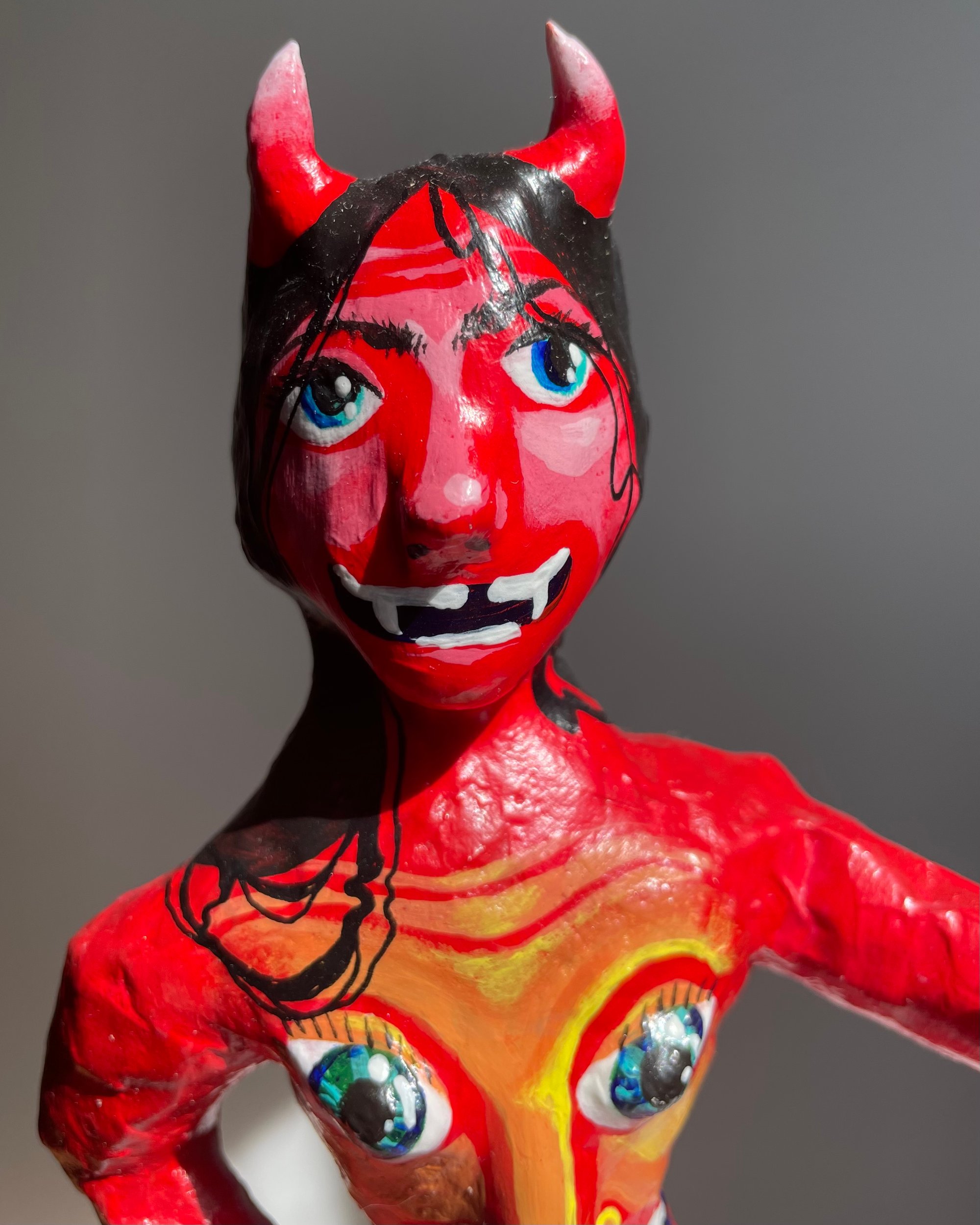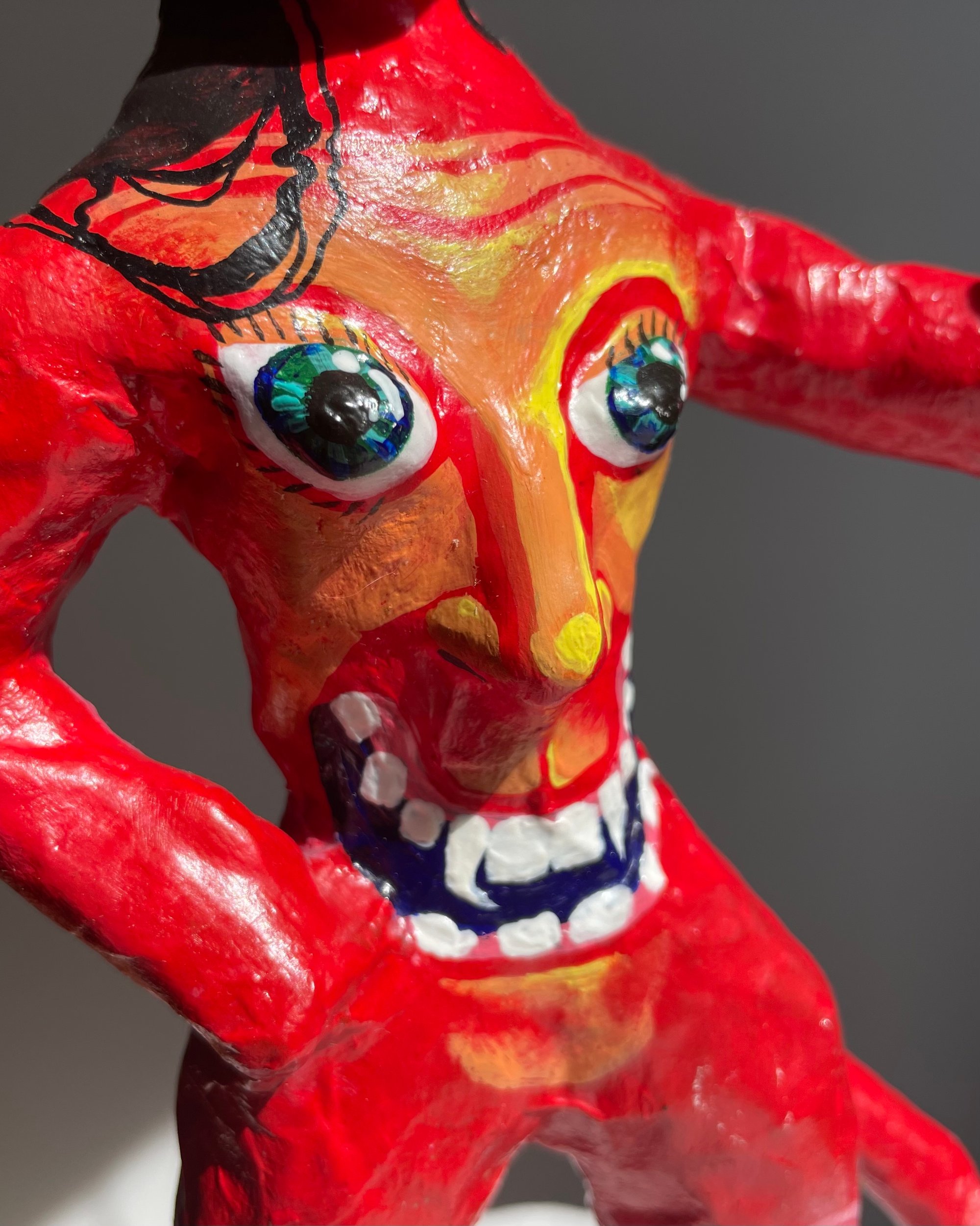 Paper mache body with clay features.