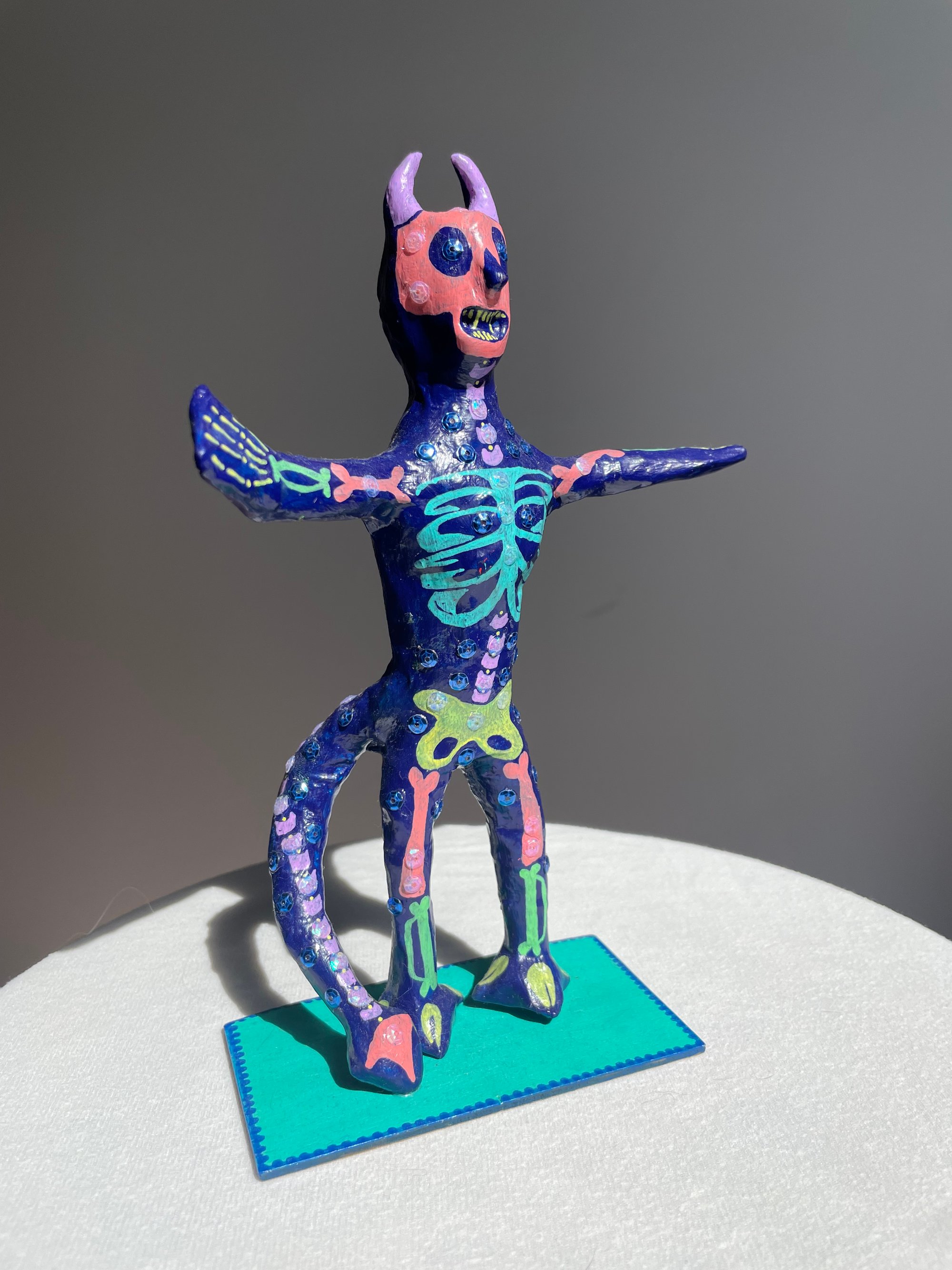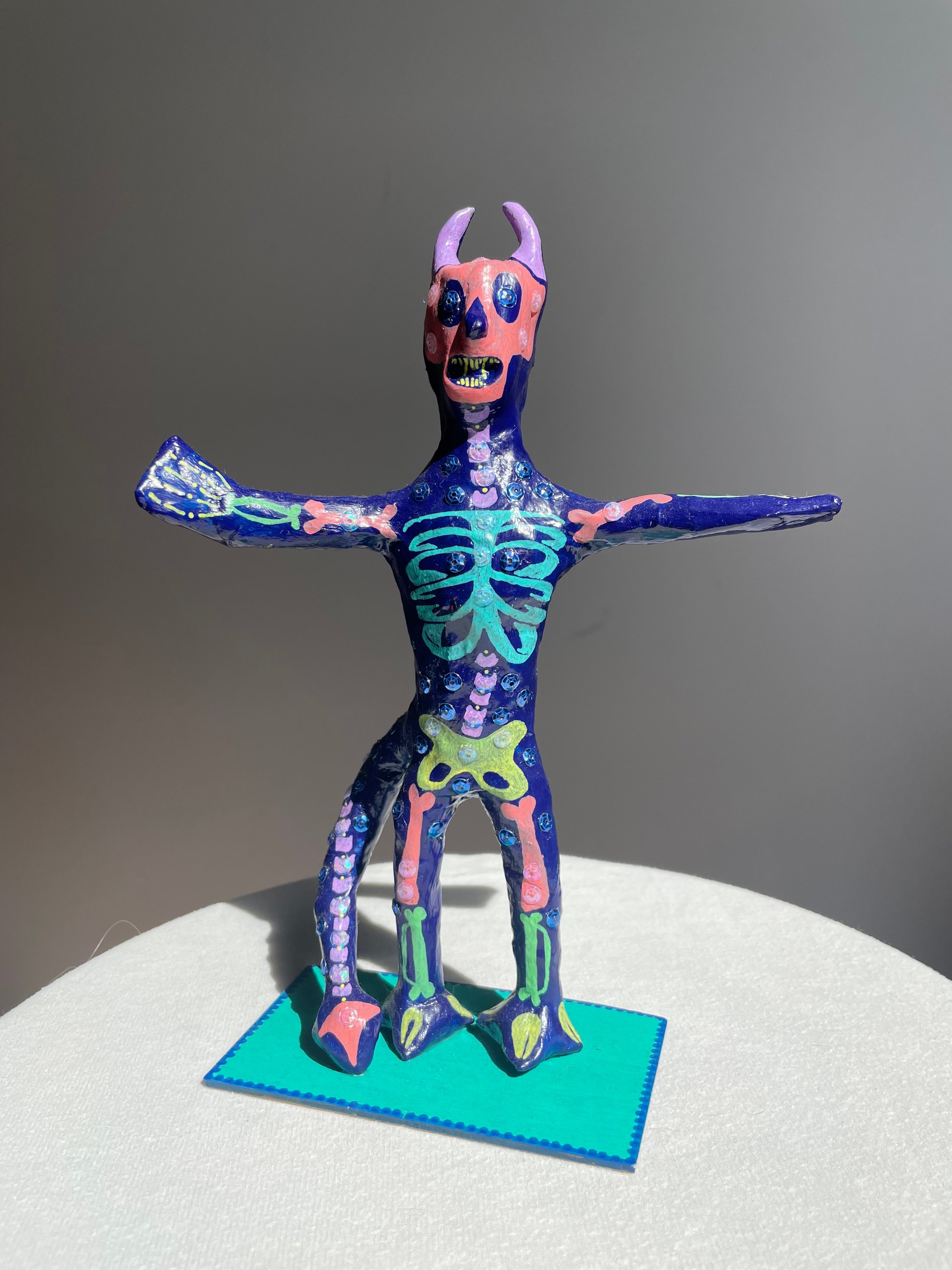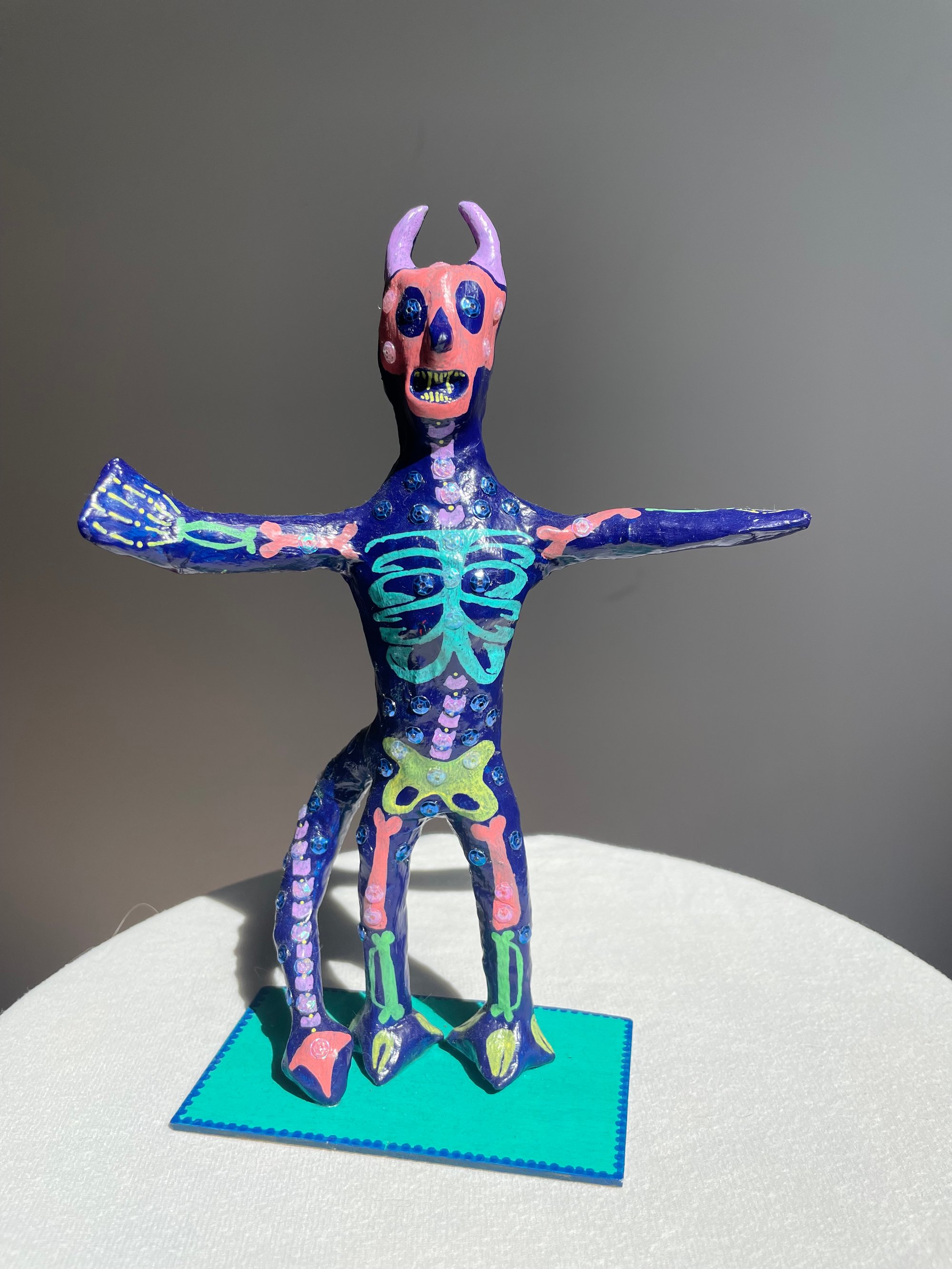 Paper mache body with clay features.